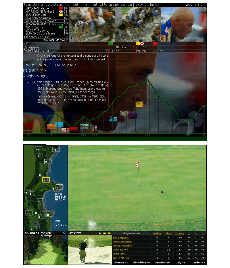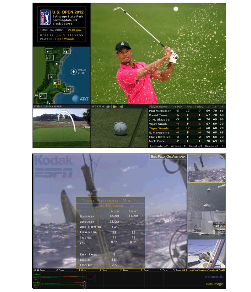 Application have been created for interactive sport's television and for online sports fans. The interface allows users to select from multiple cameras during live events, integrates a sponsor channel and includes a large primary viewing area. I reshaped the assets being delivered during live productions, into an experience that enabled users to follow and get detailed information about their favorite athletes, choose from any available cameras and replay favorite moments. Please see examples below.